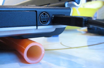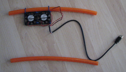 I have always complained about my HP Pavilion's noisy CPU fan. So in an effort to keep my laptop cooler with less interference from the CPU fan I build my own laptop cooler. The use of hoses was inspired by another DIY laptop stand I had seen on the net. Add 2 Princess Auto 5v fans, a USB cable and minimal solder and you get this: